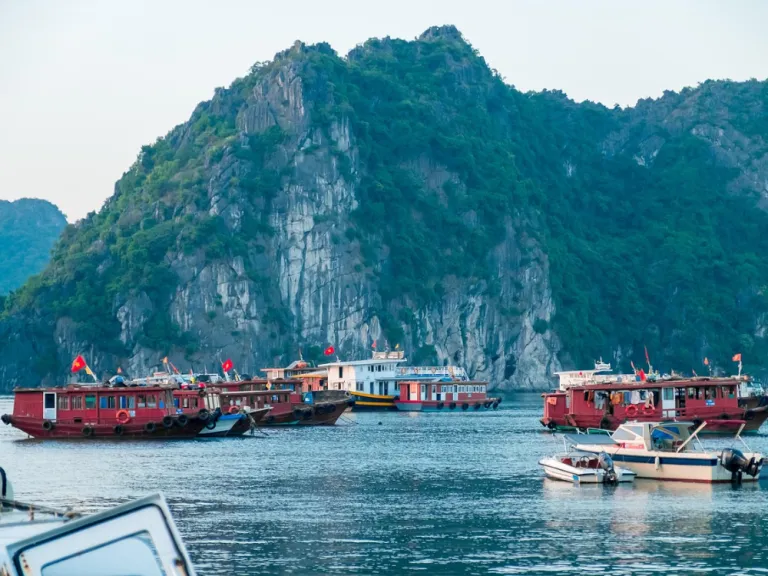 Small caves rest within the cliffs, and lantern light casts warm colours across ancient stone. Light winds brush across the water, and soft waves tap gently against wooden hulls. Locals guide travellers through narrow passes with clear skill and patient rhythm. The entire bay feels alive, yet calm, and remains a treasured part of Vietnam’s coast.