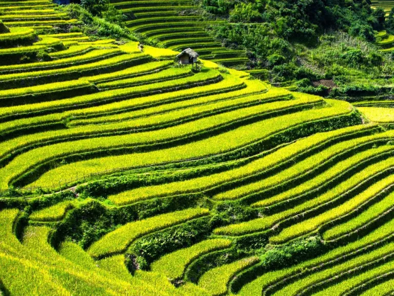 Green terraces rise in smooth layers, and sunlight settles across fields with soft golden edges. The slopes form a natural pattern that shifts in colour through each hour of the day. Visitors pause at viewpoints that face open valleys while birds pass quietly overhead. The setting combines artistry, nature, and centuries of careful craft in a peaceful rural landscape.