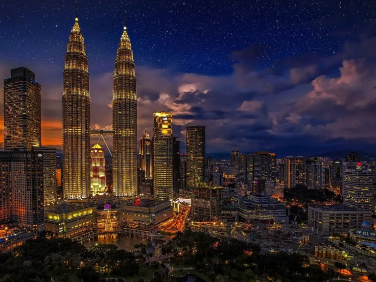 Twin towers rise above Kuala Lumpur, in Southeast Asia, with steel lines that cut sharply against the sky. Each level holds precise detail, and the structure glows bright at night with strong white light. Visitors step onto the skybridge and see the entire city stretch across the horizon. The contrast between modern design and cultural depth forms a memorable part of the experience.