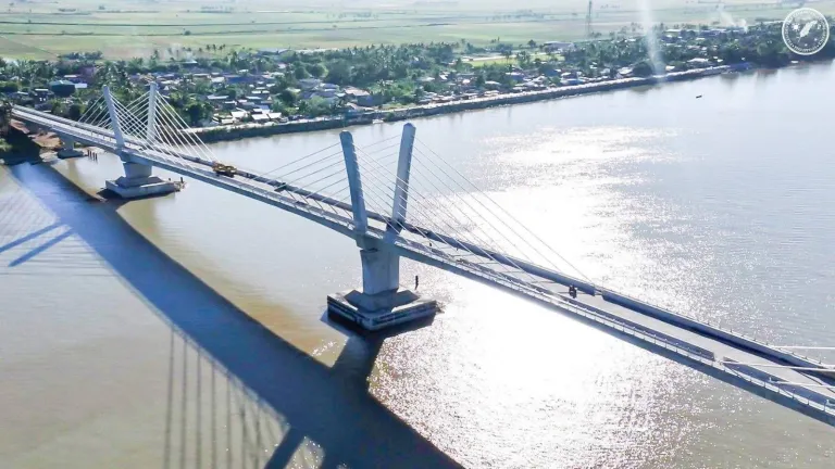 The Camalaniugan Bridge connects the towns of Aparri and Camalaniugan in Cagayan Province. It is 1.58 kilometres long, with 1.10 kilometres of approach spans and a 0.48-kilometre cable-stayed main span. The design rises elegantly above the river and blends modern engineering with the natural surroundings.
