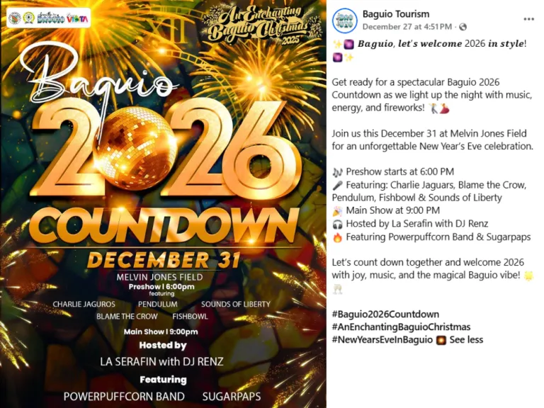 If you want to welcome 2026 in cold weather, go to Melvin Jones Field in Baguio. This is part of the "An Enchanting Baguio Christmas" festival. It has many local singers and a beautiful fireworks show over Burnham Park.