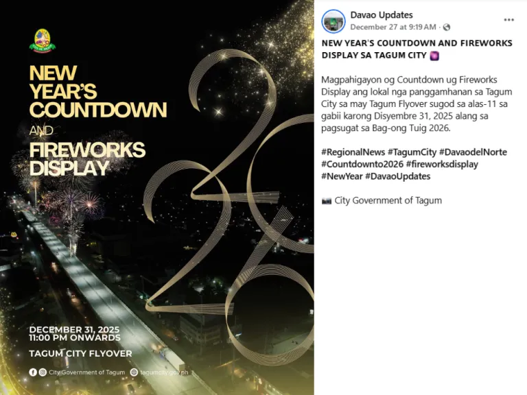People in Davao del Norte can go to the Tagum Flyover. The local government has a big fireworks display so that everyone in the city can see it from far away.