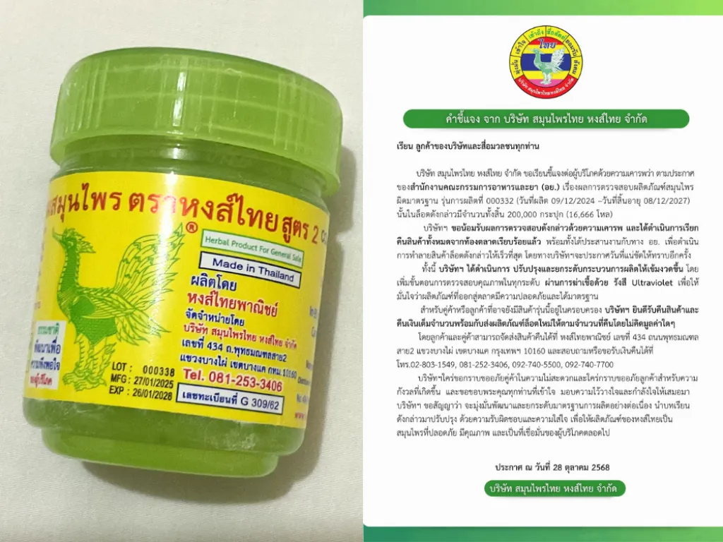 The manufacturer, Hong Thai Panich, admitted the contamination issue and said it has already started removing the affected products. The company added that other batches are safe and not affected by the contamination.