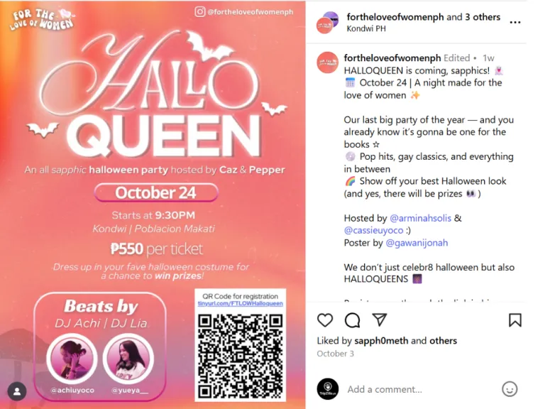 This one’s for the girls, gays, and theys. HALLOQUEEN is happening on October 24 at Kondwi Poblacion, organised by For the Love of Women PH and hosted by queer couple Caz and Pepper.