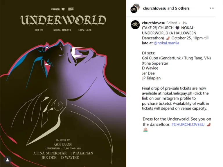 If you plan to dance until sunrise, UNDERWORLD by CHURCHLOVESU is for you. It’s happening on October 25 at Nokal Manila, featuring DJ Goi Cuon, Xtina Superstar, D Waviee, Jer Dee, and JP Talapian.