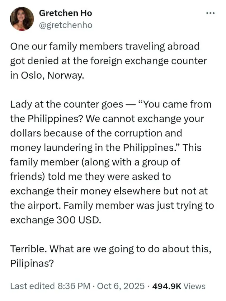 Gretchen Ho recently caught everyone’s attention after sharing a story about a family member who was denied currency exchange at Oslo Airport in Norway. In her post, she revealed that the staff at the foreign exchange counter said, “You came from the Philippines? We cannot exchange your dollars because of the corruption and money laundering in the Philippines.”