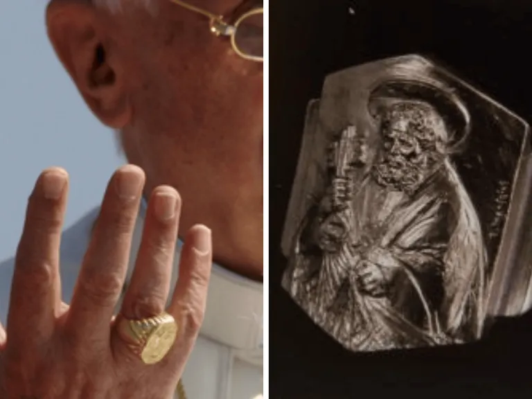 (L-R) Pope Benedict XVI's Ring of the Fisherman | Franco Origlia via Wikimedia Commons; Pope Francis' Fisherman's Ring | Vatican Radio Official Website