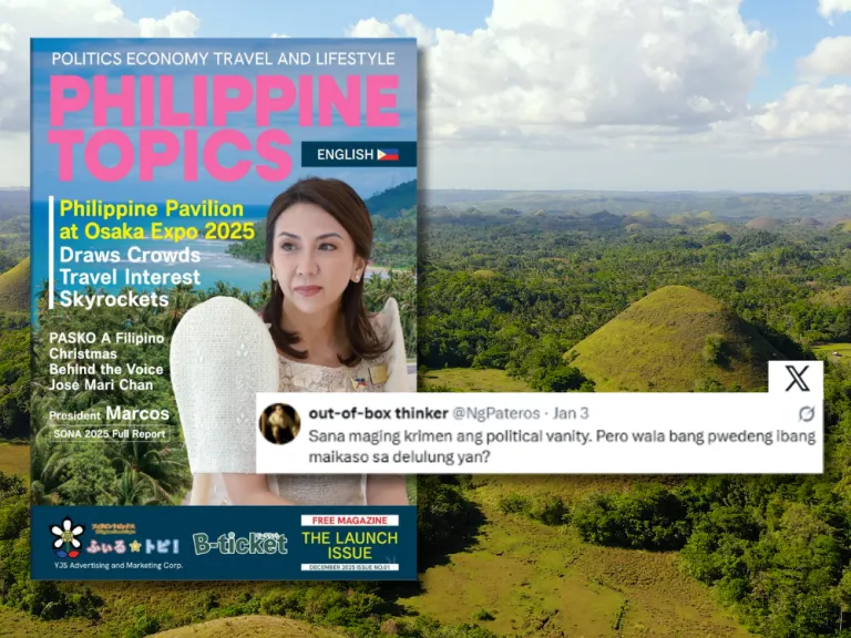 The drama started with the December issue of Philippine Topics. Secretary Frasco is pictured posing on a beach for a story about the Philippines’ pavilion at the Osaka Expo. The cover immediately triggered an online fight, with critics arguing that Frasco’s face is being marketed more than the actual tourist spots we need to sell to the world.