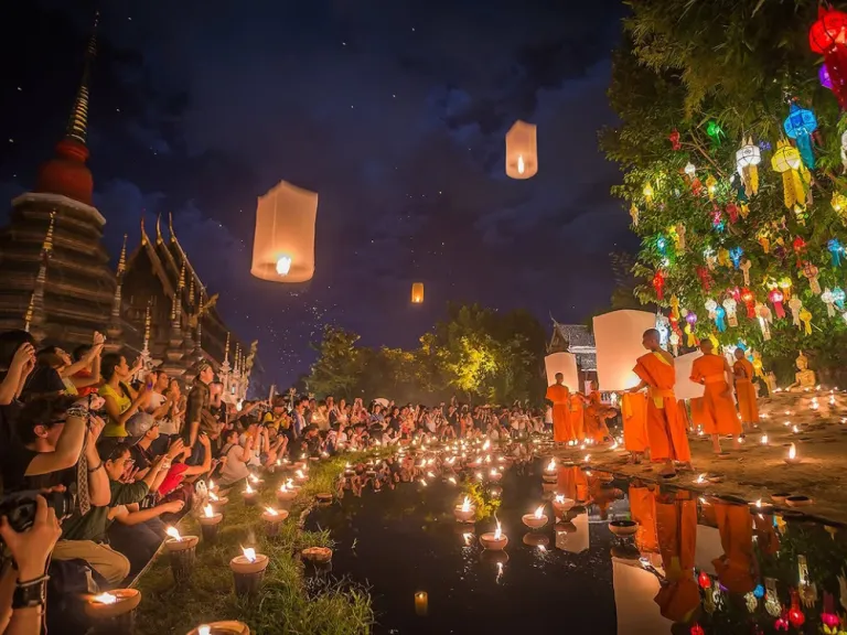 If you’ve ever dreamed of being in that moment, now’s your chance. Every November, Chiang Mai lights up with thousands of lanterns drifting into the night sky and krathongs (small decorated baskets) floating down the river.