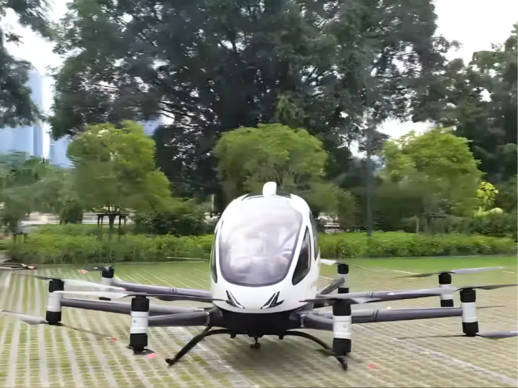 The star of the show is the EH216-S, an electric vertical take-off and landing aircraft that looks like a massive drone but carries people instead of parcels. It runs on battery power and flies automatically without a pilot.